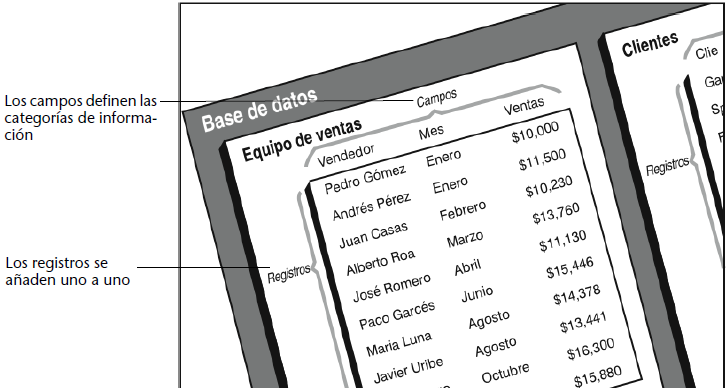 La información en una base está organizada en forma de registros. Cada registro contiene toda la información sobre una persona o un elemento de la base. Por ejemplo, cada registro en el directorio telefónico contiene el nombre, dirección y número telefónico de una persona.