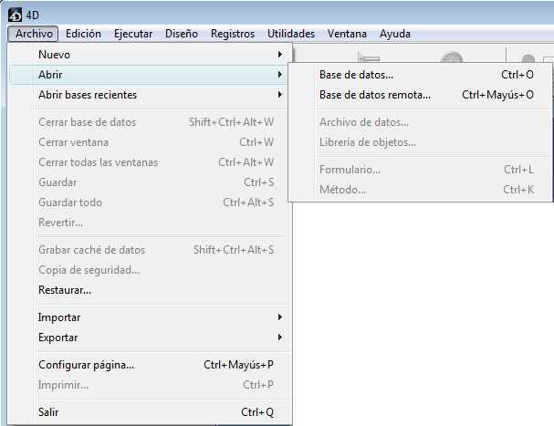 Los archivos que se encuentran en estos directorios son mostrados por 4D en el submenú Abrir bases recientes del menú Archivo: