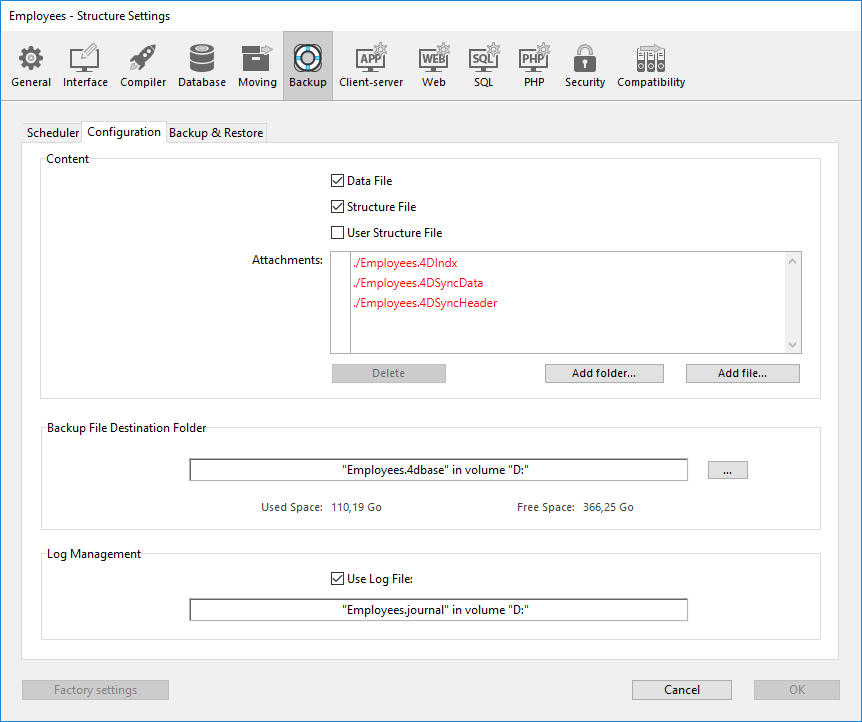 • Structure File: Database structure file. In cases where databases are compiled, this option allows you to backup the .4dc file.