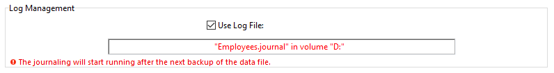 Activating a new log file requires the data of the database to be backed up beforehand. When you check this option, a warning message informs you that a backup is necessary: