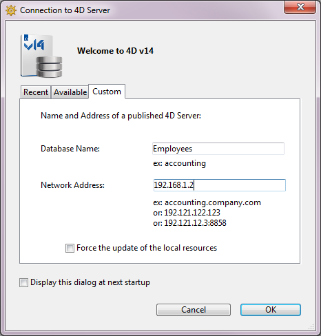 4D Server接続ダイアログボックスが表示されます。このダイアログボックスには最近使用したサーバ、利用可、そしてカスタムの3つのページがあります: