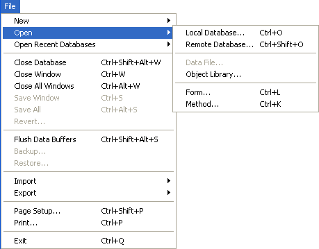 - 最近使用したデータベースを開くサブメニュー (ローカル環境設定フォルダ内のファイル)
