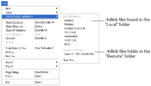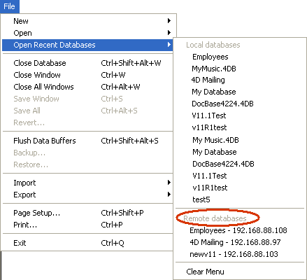 このコマンドは4Dのファイルメニューにあります。4Dを使用してローカルデータベースおよびリモートデータベースを開いている場合、このメニューには両タイプのデータベースがリストされます。リモートデータベースはメニューの下部にリストされます:
