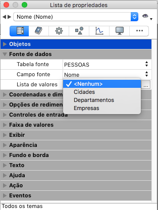 O conteúdo da Lista de propriedades é contextual. Quando o atributo Editável não está selecionado na Lista de propriedades, as propriedades relacionadas com o controle de entrada de dados (Obligatório, Tabulável, Filtro de entrada, etc.) desaparecem da lista.