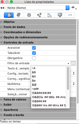 Esta propriedade é encontrada no tema “Entrada” da Lista de propriedades para os objetos ativos (editáveis ou não) como también para los campos no editables.