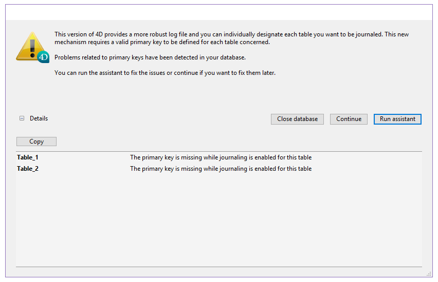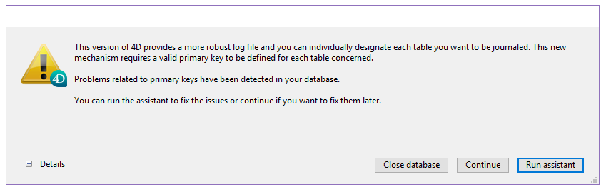 4D v14以降、ログファイルの使用には、ログファイルを使用するためにはログを取るテーブルが全て有効なプライマリーキーを持っている必要があり(ログファイルの管理 を参照して下さい)、また4D v17 以降は、公開されているテーブルはORDA 機能を使用するためにはプライマリーキーを持っている必要があります(ORDA 参照)。