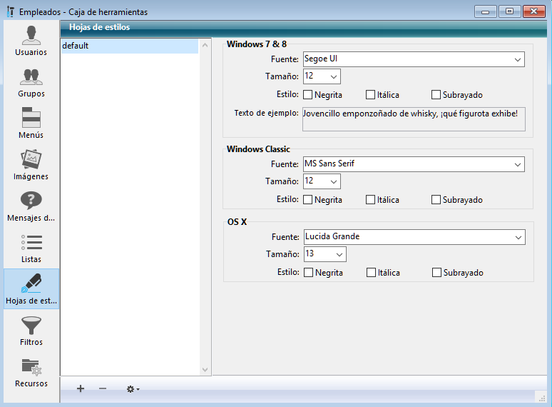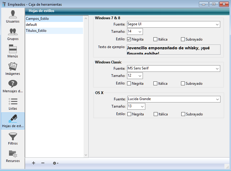 4. En el área de definición de la hoja de estilo, seleccione la fuente, tamaño y opciones de estilo que quiera para cada plataforma de ejecución de la base.