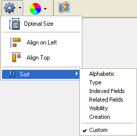 Applying a sort criterion. You have several sort criteria available using the Sort sub-menu associated with the tools button of the editor: When you choose an option, it is applied to all the tables selected in the window. This menu is disabled when no table is selected. The menu also indicates the criterion that is currently applied with a checkmark. Several checkmarks are displayed when different criteria are used in the selection of tables. You can select a sort criteria from among the following: