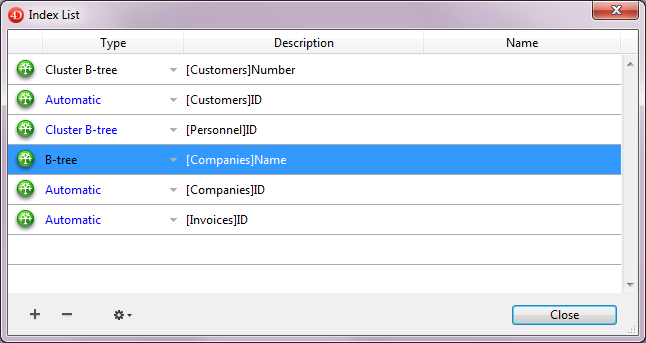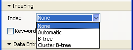 • Type: Index type. Each type of index (B-tree, Cluster B-Tree, keyword) is depicted with a different icon. It is possible to modify the index type from the Index explorer by clicking on the inverted triangle and selecting a value in the pop-up menu.