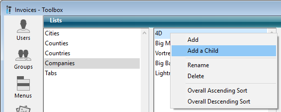 2. オプションメニューまたは項目リストのコンテキストメニューから子を追加を選択します。