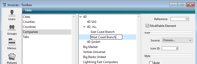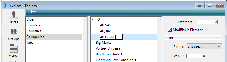 4Dは選択されたリスト要素を展開し、サブリスト上の最初の項目として新しい項目を作成します (デフォルトで“新規アイテム # X”という名前が付けられます) 。
