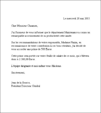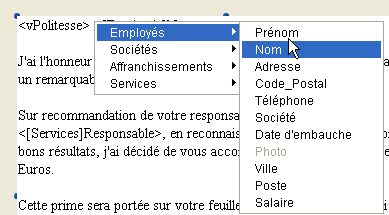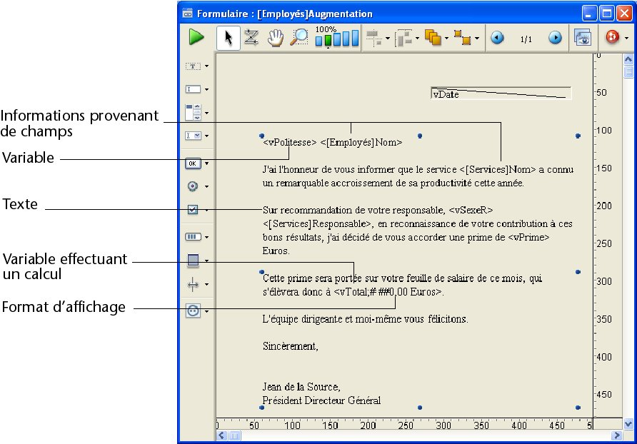 Vous pouvez spécifier la manière dont sera affiché le champ ou la variable en insérant un point virgule suivi d’un des LIRE PARAMETRE ELEMENT de la base. Par exemple, le document affiché ci-dessus contient un format d’affichage pour la variable vAugment. La variable <vAugment;### ##0.00 Euros> calcule le montant du bonus de la personne et l’affiche dans un format adéquat.