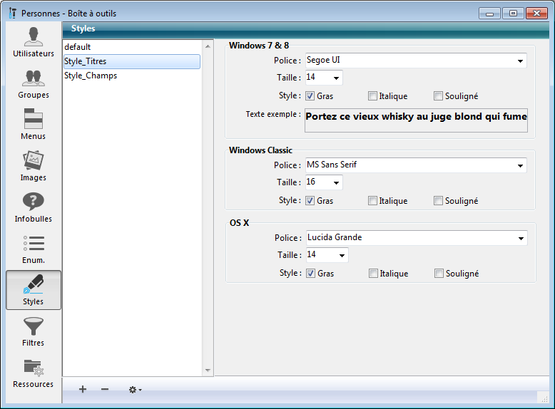 4. Dans la zone de définition de la feuille de style, choisissez la police de caractères désirée, sa taille et ses options de style pour chaque plate-forme d’exécution de la base.
