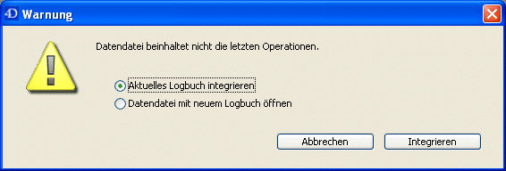 Ist die Option für automatisches Integrieren des Logbuchs nicht aktiv, erscheint beim Öffnen der Datenbank eine Meldung, wenn 4D feststellt, dass das Logbuch mehr Operationen enthält als in der Datenbank ausgeführt wurden