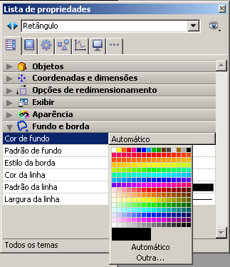 Nota: na lista de propriedades, a cor de fundo é chamada Cor de Fundo, e a cor de primeiro plano é chamada Cor da Linha. Para objetos com texto, a cor do texto corresponde a Cor de letras.