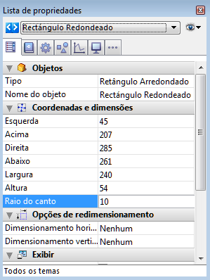 A propriedade Rádio da esquina se encontra no tema "Coordenadas e dimensões" da Lista de propriedades para os objetos de tipo Retângulo arredondado: