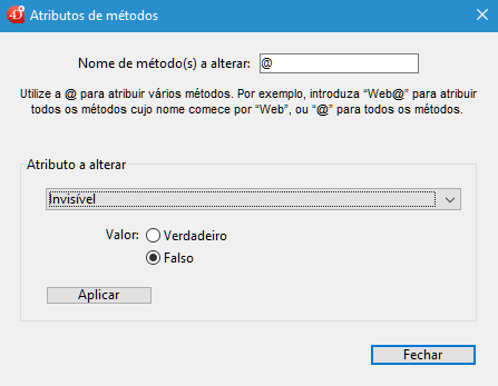 A caixa de diálogo "Atributos dos métodos", permite modificar um atributo de método projeto (Invisível, Oferecido como serviço web, etc) para todos ou alguns dos métodos de projeto do banco de dados em somente uma operação. Esta função é especialmente útil para modificar os atributos de um grande número de métodos de projeto. Da mesma forma é possível utilizar durante o desenvolvimento para aplicar atributos comuns a grupos homogêneos de métodos.