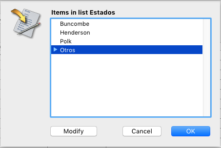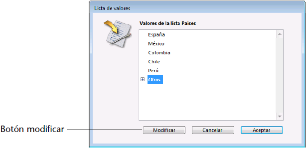 Si una lista es modificable, el botón Modificar está activo en la caja de diálogo Lista cuando utilice la base.