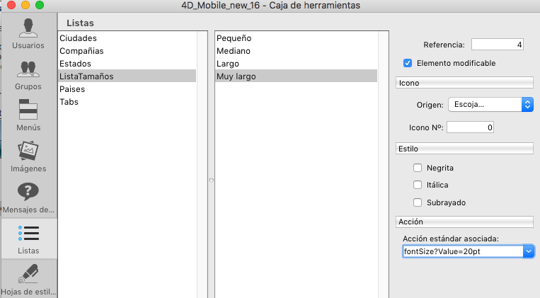 4D le permite especificar si una lista de elementos puede ser modificada por el usuario cuando la lista se muestra como una lista de selección. Por defecto, una lista no es modificable.