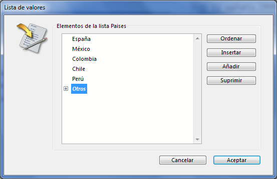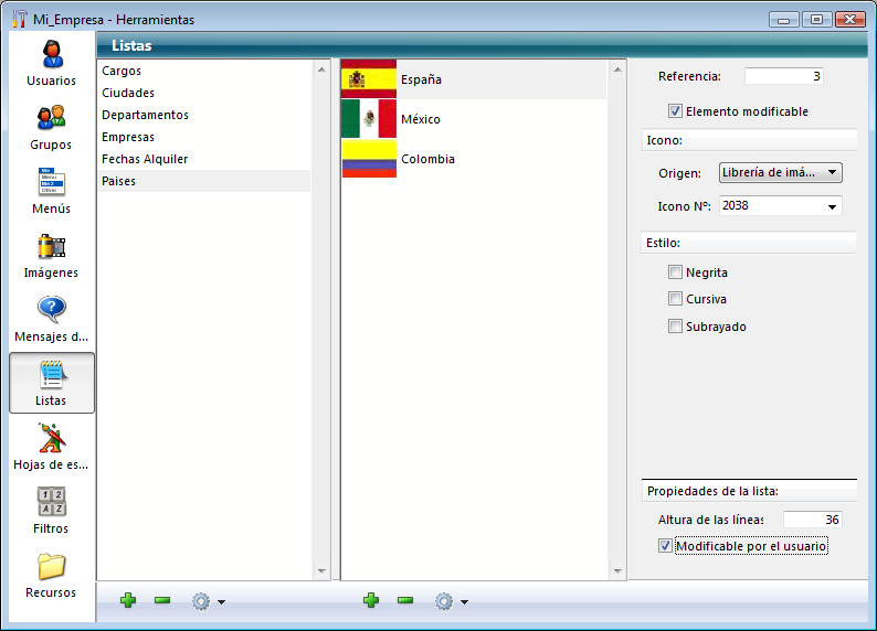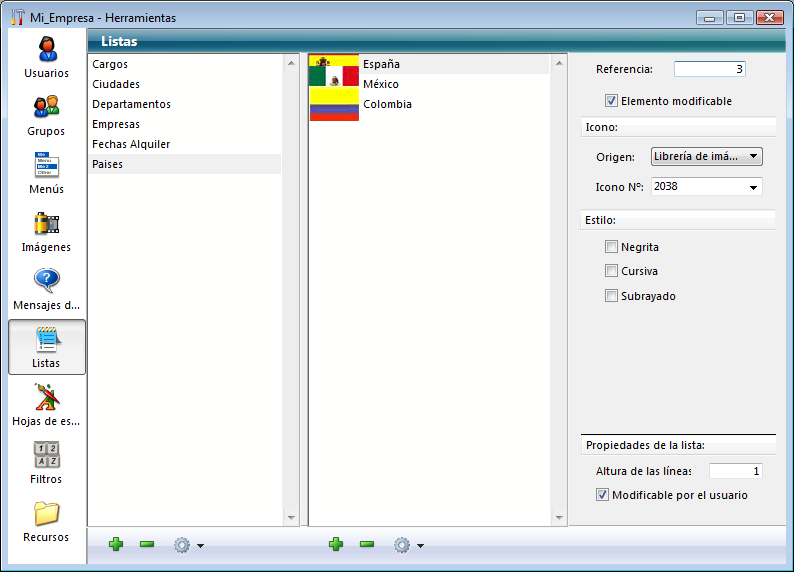Nota: cuando una lista está asociada a un combo box (ver la sección Combo box), los elementos son siempre modificables.