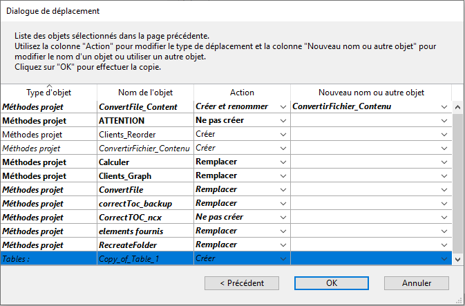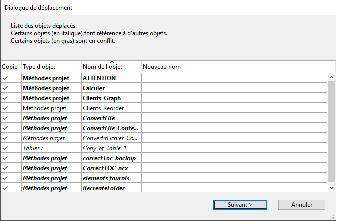 Lorsque vous déplacez une sélection d’objets (par glisser-déposer ou copier-coller) entre deux bases 4D ou entre une base de données et une bibliothèque d’objets, vous avez la possibilité d’afficher une boîte de dialogue listant tous les objets déplacés ainsi que les actions qui leur seront associés dans la base de destination.