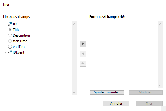 - Boutons Ajouter formule... et Modifier... : ces boutons vous permettent d’écrire ou de modifier des formules utilisées comme critères de tri. Vous utilisez une formule de tri lorsque vous voulez effectuer un tri sur un attribut de champ objet ou sur autre chose qu’un champ, comme une variable calculée ou une partie seulement d’un champ. Par exemple, vous pouvez trier les enregistrements par rapport au calcul du taux de rejet des pièces détachées ou par rapport aux quatre derniers chiffres d’un champ Numéro de pièce.