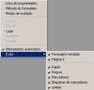 Papel: exibe ou oculta as margens da página de impressão, com linhas de cor cinza. Esta opção pode não ter efeito quando está selecionada a opção Limites (ver abaixo). Se o tamanho do formulário é menor que o tamanho da página de impressão, as margens da página aparecem fora do formulário. Consulte a seção Imprimir um formulário.