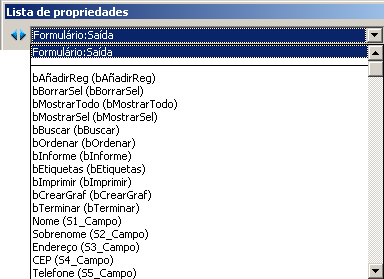 Pode selecionar os elementos cujas propriedades deseja mostrar clicando sobre eles no formulário ou usando a lista de seleção, localizada na parte superior da janela Lista de propriedades. A lista de seleção contém três partes, separadas por uma linha: