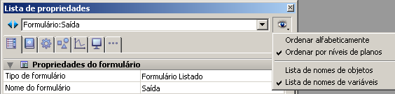 A lista de propriedades mostra as propriedades do formulário ou as do objeto selecionado: