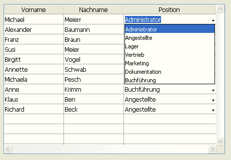 Hier bestimmen Sie Listen zum Steuern der Dateneingabe in Spalten der Listbox.