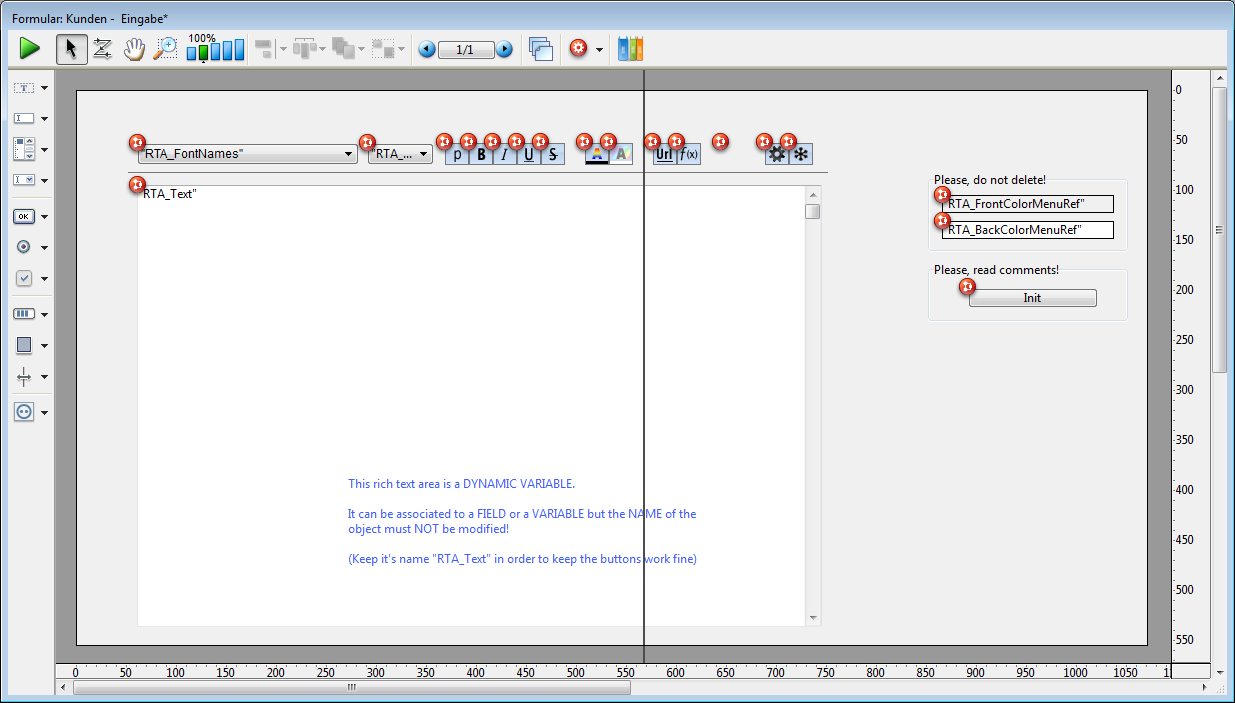 Der Bereich besteht aus einer dynamischen Variable mit Namen “RTA_Text”. Damit die Menüs und Schaltflächen korrekt funktionieren, dürfen Sie diesen Namen nicht verändern.
