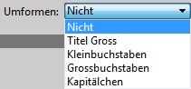 Das DropDown-Menü Vert. Ausr. bietet die Optionen Hochgestellt und Tiefgestellt für Text, das DropDown-Menü Umformen bietet verschiedene Optionen für Groß- und Kleinschreibung:
