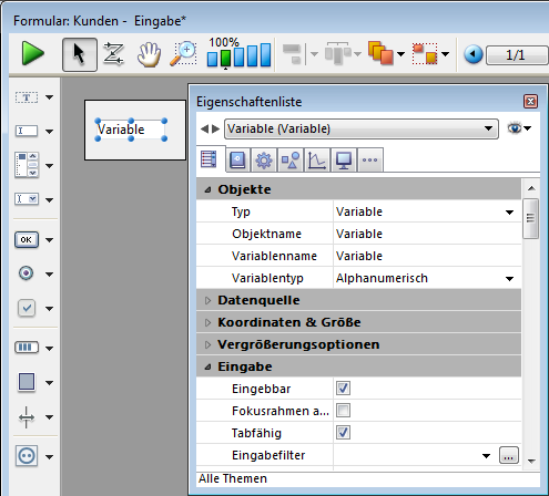 Fügt eine eingebbare Variable vom Typ String hinzu. Sie können den Typ oder andere Eigenschaften über die Eigenschaftenliste ändern.