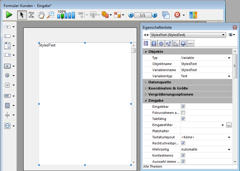 Fügt einen Textbereich mit Mehrfachstil (Variable) hinzu, wo Sie Schriftart, -stil und -farbe definieren können. Der Bereich ist vergrößerbar, hat einen vertikalen Rollbalken und ein Kontextmenü. Sie können diese Standardvorgaben über die Eigenschaftenliste ändern.
