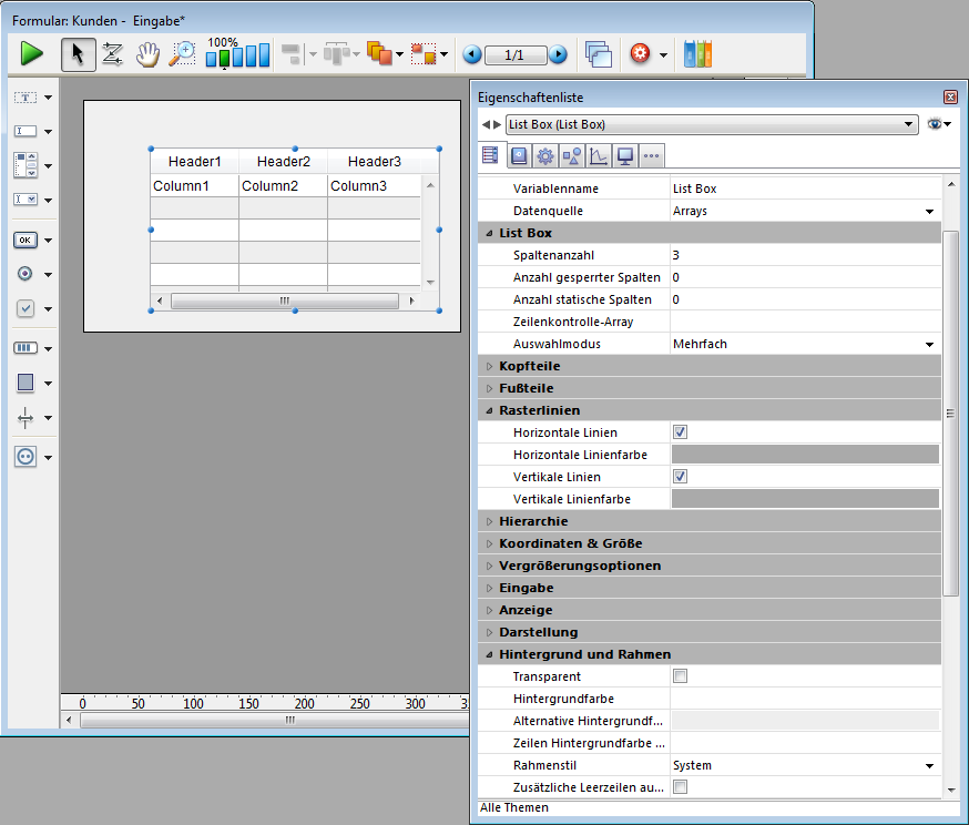 Fügt eine dreispaltige Listbox zum Anzeigen von Daten in Arrays hinzu. In der Eigenschaftenliste können Sie die Datenquelle und die gewünschten Optionen definieren.