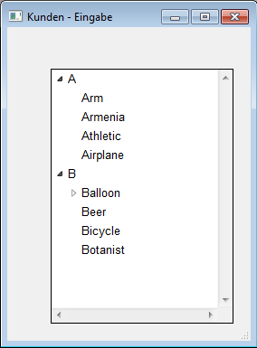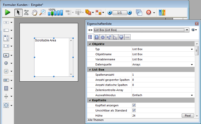 Fügt einen rollbaren Bereich hinzu, das ist eine Listbox mit einer einzelnen Spalte ohne Kopf- und Fußteile. Dieser Bereich ist standardmäßig nicht eingebbar. Sie können ihn jedoch über die Eigenschaftenliste konfigurieren.