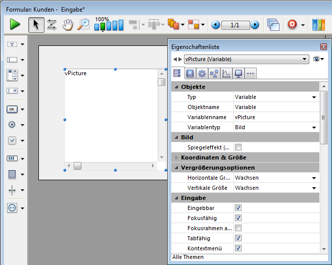 Fügt einen Bildbereich hinzu, der sich über die Eigenschaftenliste konfigurieren lässt. Sie können z.B. ein Kontextmenü oder ein Anzeigeformat zuordnen.