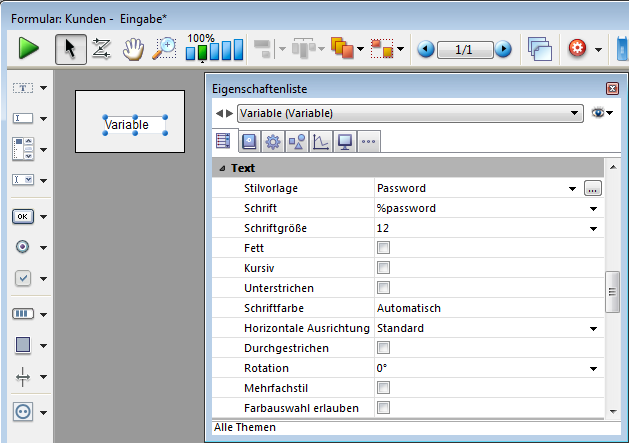 Fügt eine eingebbare String Variable mit der Stilvorlage “Password” hinzu, d.h. die eingegebenen Zeichen erscheinen als Sternchen. Sie können diese Eigenschaften über die Eigenschaftenliste ändern.
