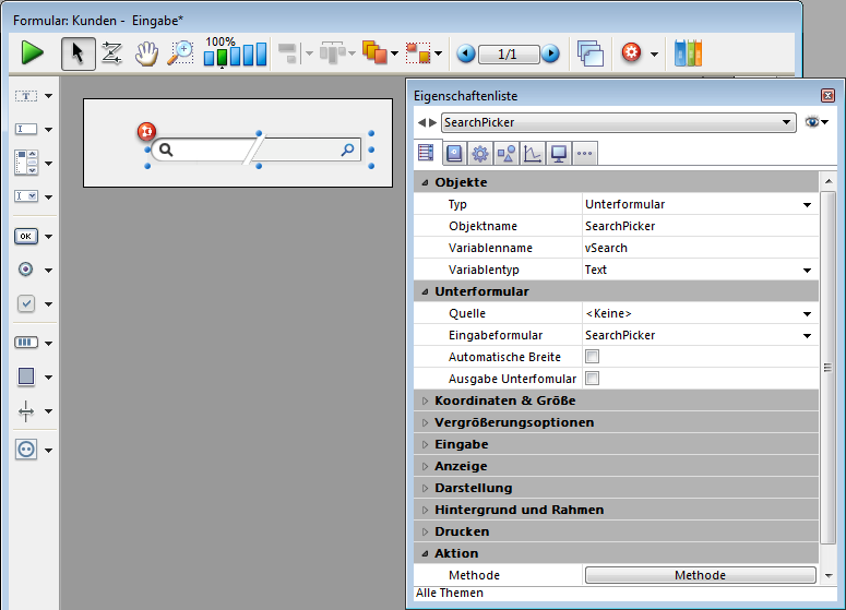Fügt einen Bereich SearchPicker hinzu mit Objektmethode und anpassbarem Beispielcode. Sie können die Eigenschaften in der Eigenschaftenliste verändern.