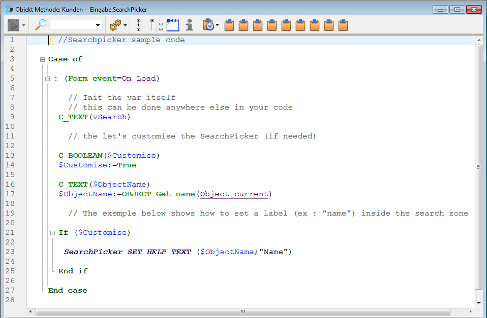 Sie können den Beispielcode in der Objektmethode verändern und die Bezeichnung innerhalb der Suchzone über den Befehl SearchPicker SET HELP TEXT verändern.