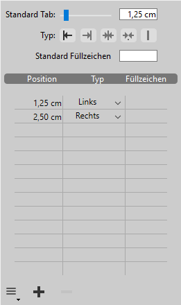 Über die Schaltfläche am unteren Rand wird im Absatz ein neuer Standard Tabulator hinzugefügt. Um einen angelegten Tabulator zu löschen, wählen Sie ihn in der Liste aus und klicken auf die Schaltfläche .