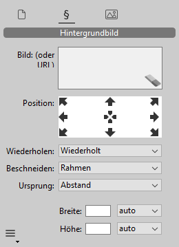 Dieses Panel steuert Hintergrundbilder, Textfelder für den 4D Write Pro Bereich.