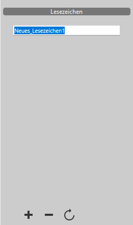 Um ein Lesezeichen zu erstellen, wählen Sie den entsprechenden Textausschnitt und klicken am unteren Rand auf die Schaltfläche : In der Liste erscheint der Eintrag "Neues_Lesezeichen1". Sie können ein Lesezeichen jederzeit umbenennen; klicken Sie auf den Eintrag, können Sie den Namen ändern. Beachten Sie, das nur alphanumerische Zeichen erlaubt sind.