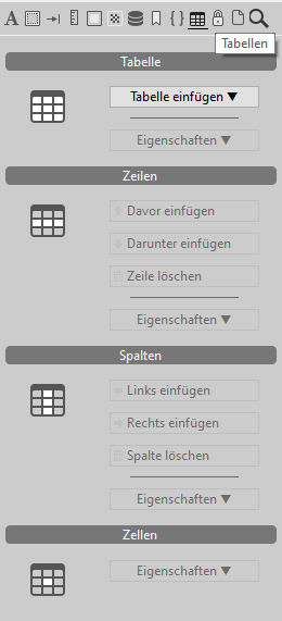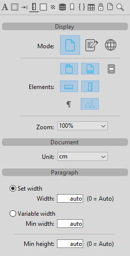 Standardmäßig wird das 4D Write Pro Widget-Unterformular "control panel" mit mehreren Symbolen angezeigt. Jeder Icon öffnet ein Steuer-Panel mit spezifischen Attributen. Sie sind folgendermaßen gegliedert: