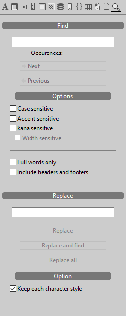 Dieses Panel verwaltet die Operationen zum Suchen und Ersetzen von Text.
