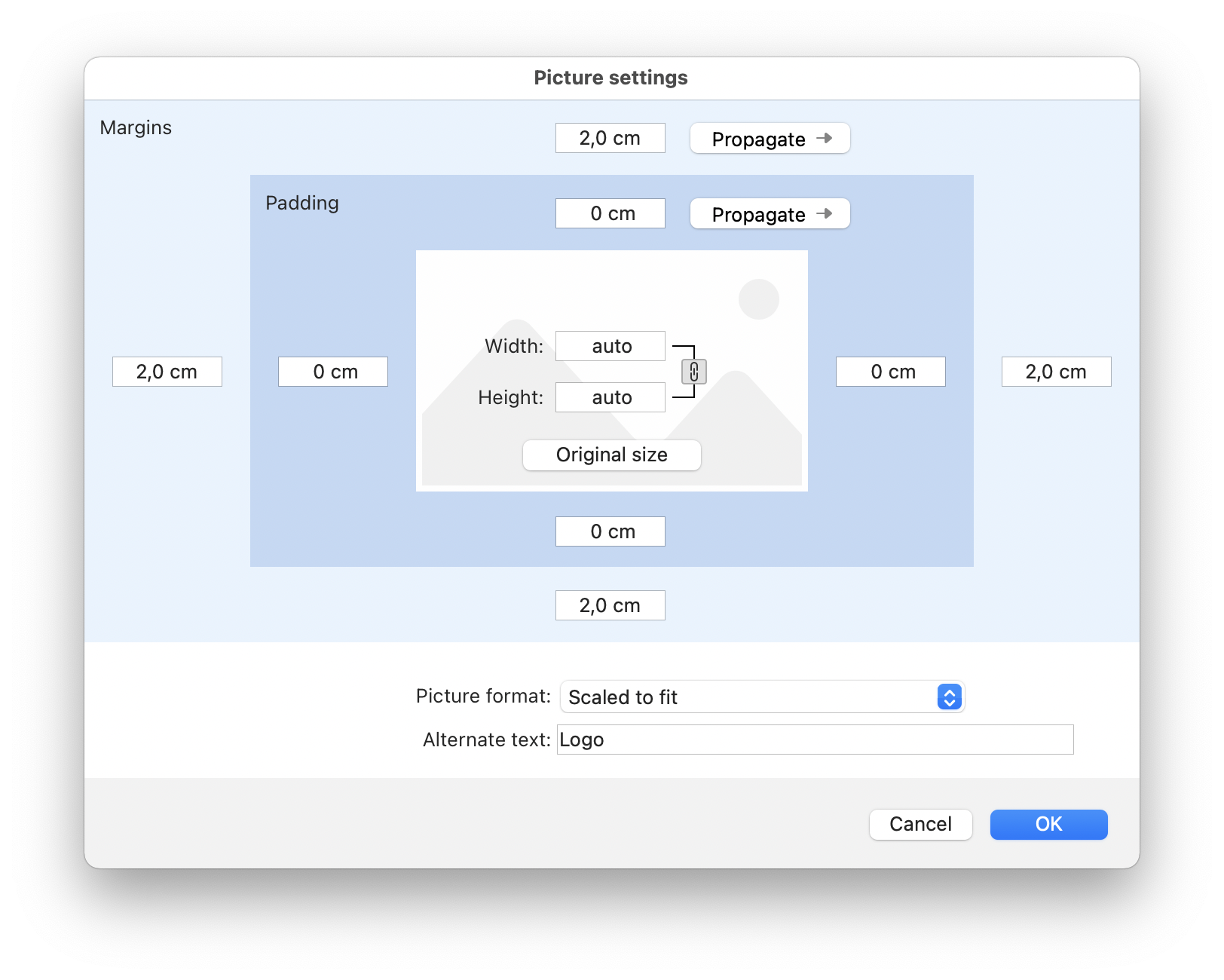 Klicken Sie auf Erweiterte Einstellungen... (nur Bilder), um ein Dialogfenster zu öffnen, in dem Sie die Größe und erweiterte Optionen für das ausgewählte Bild festlegen können