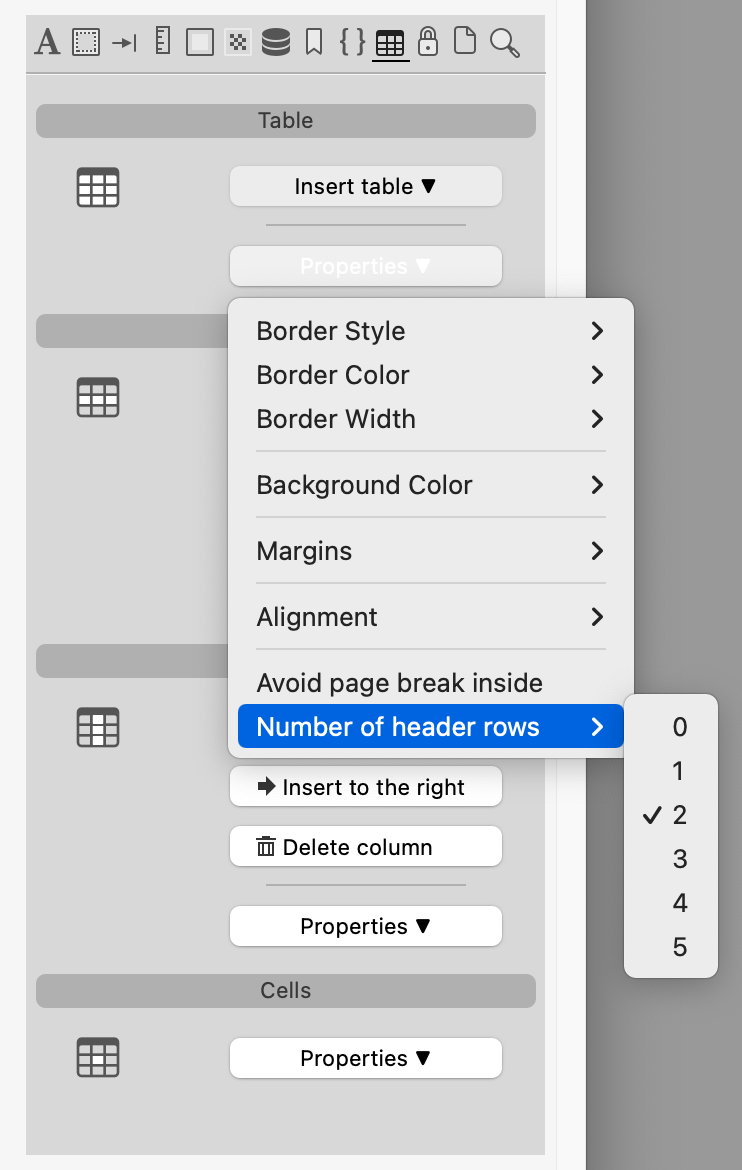 • 4D Ausdrücke einfrieren: wandelt die aktuellen 4D Ausdrücke in Plain Text um (kann nicht rückgängig gemacht werden). Kann auf das Dokument, die Auswahl oder die Tabellen angewendet werden.