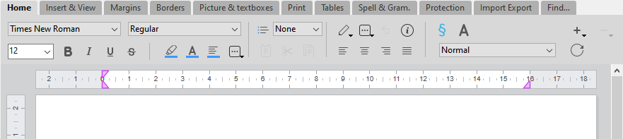 Dieses Panel bietet Standardoptionen zur Ausrichtung von Text und setzt die Ränder für den 4D Write Pro Bereich.