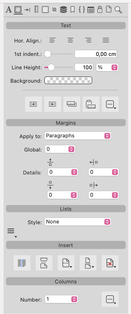 In diesem Panel können Sie auch Ihre Absätze verwalten, Umbrüche einfügen, Abschnitte löschen oder deren Attribute zurücksetzen und Ihre Spalten konfigurieren.