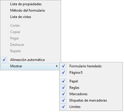 Seleccione Mostrar en el menú Formulario. O Utilice el comando Mostrar del menú contextual del editor (clic derecho fuera del objeto). Aparece un submenú jerárquico con la lista de todos los elementos que puede mostrar u ocultar: Junto a cada elemento visible aparece una marca de selección. Para ocultar un elemento, selecciónelo para que su marca desaparezca.